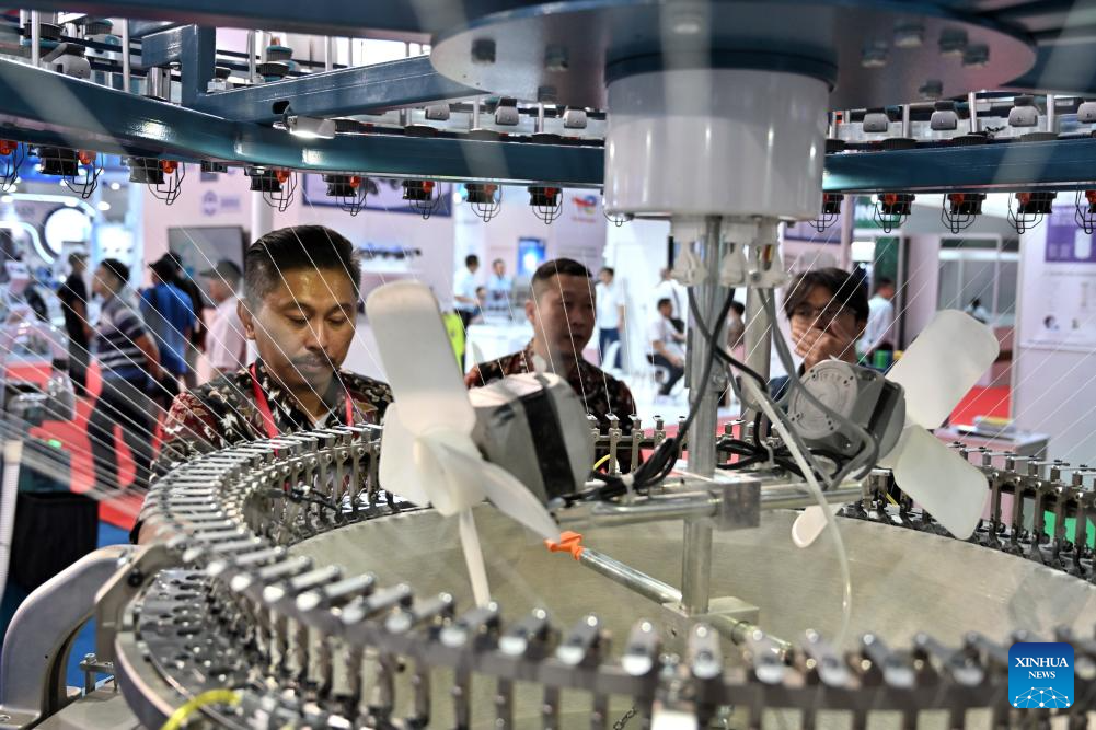 Visitors take photos of a knitting machine during INDO INTERTEX, a major textile and garment exhibition, at Jakarta International Expo, Jakarta, Indonesia, on March 21, 2024. From March 20 to 23, more than 600 companies attend INDO INTERTEX, showcasing their newest advancements in digital printing, textile chemistry, raw materials, digital technology, apparel, accessories, and other textile products. (Xinhua/Veri Sanovri)