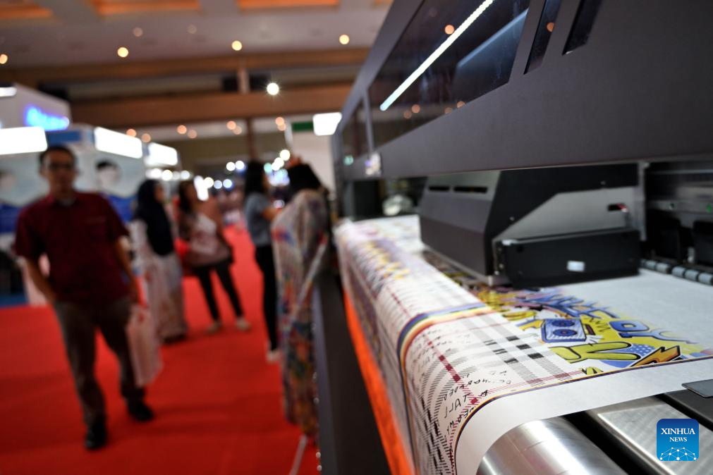 Visitors look at a printing machine during INDO INTERTEX, a major textile and garment exhibition, at Jakarta International Expo, Jakarta, Indonesia, on March 21, 2024. From March 20 to 23, more than 600 companies attend INDO INTERTEX, showcasing their newest advancements in digital printing, textile chemistry, raw materials, digital technology, apparel, accessories, and other textile products. (Xinhua/Veri Sanovri)