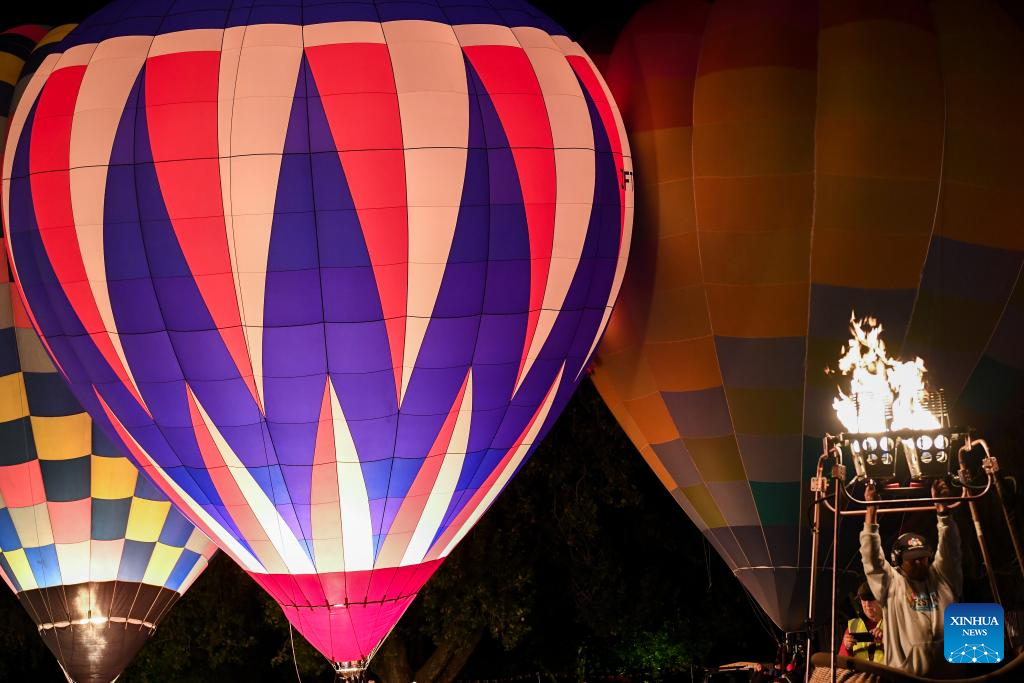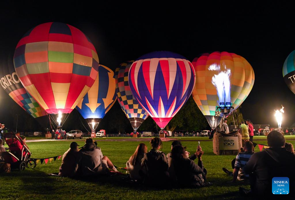 Hot air balloons illuminate during a night glow event in Hamilton, New Zealand, March 23, 2024. The 5-day annual balloon festival concluded on Saturday. (Xinhua/Guo Lei)
