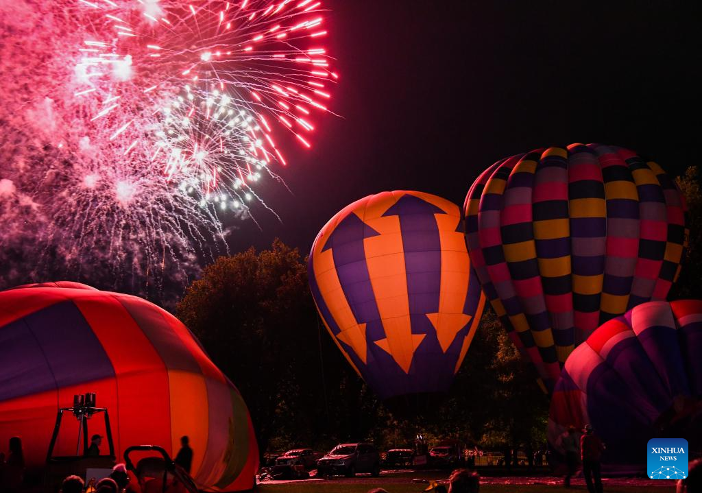 Fireworks are seen during a hot air balloon festival night glow event in Hamilton, New Zealand, March 23, 2024. The 5-day annual balloon festival concluded on Saturday. (Xinhua/Guo Lei)