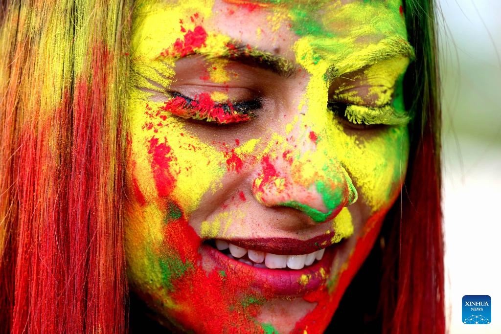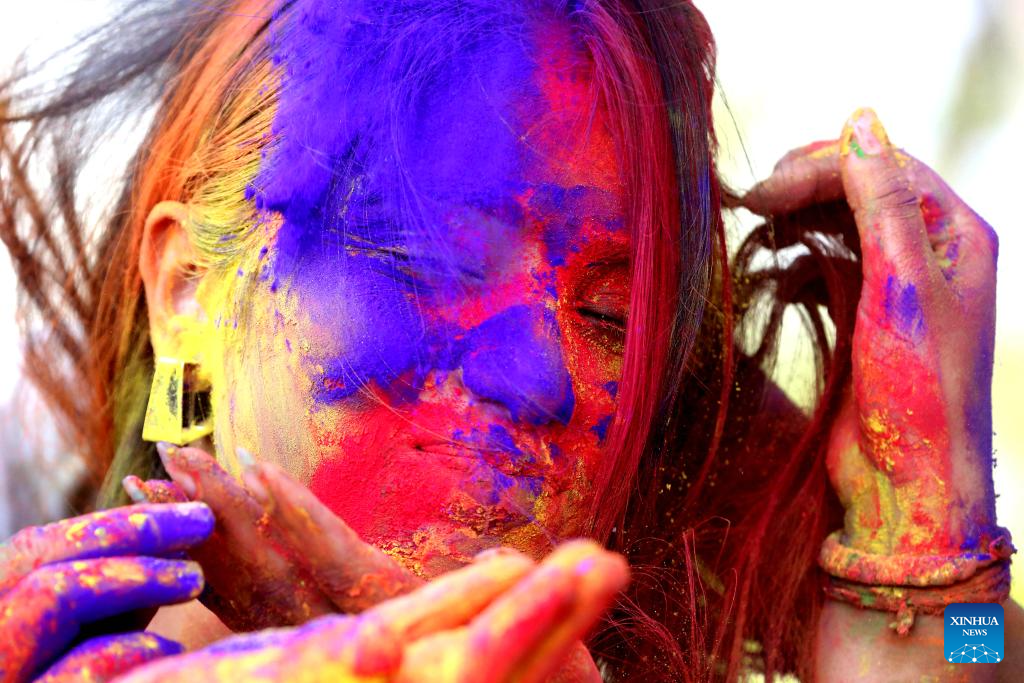 A woman has her face smeared with colored powder during the celebration of Holi festival in Bhopal, India, March 22, 2024. Holi, the festival of colors, marks the beginning of the spring season. (Str/Xinhua)