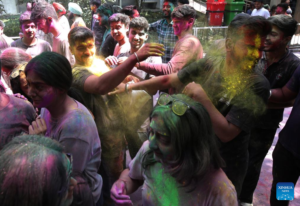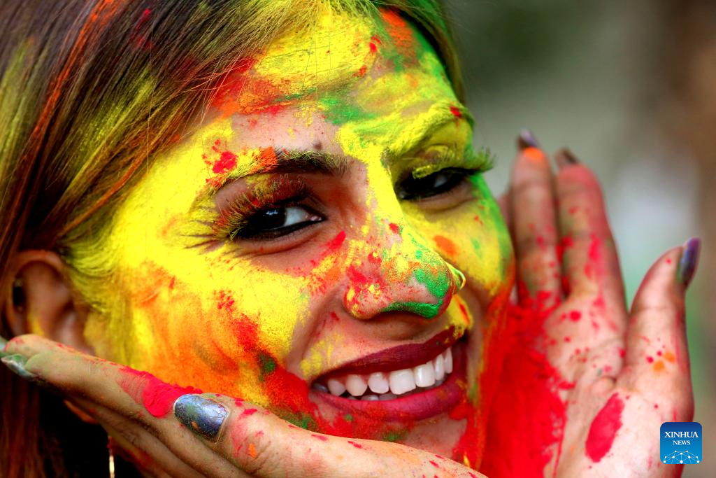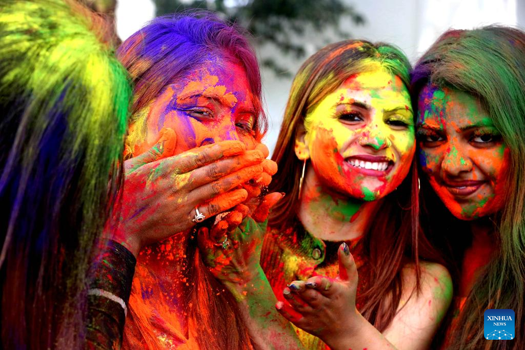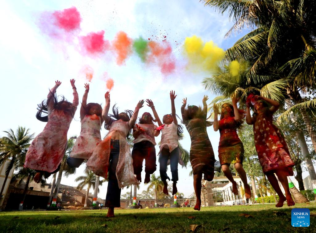 Women smeared with colored powder celebrate Holi festival in Bhopal, India, March 22, 2024. Holi, the festival of colors, marks the beginning of the spring season. (Str/Xinhua)