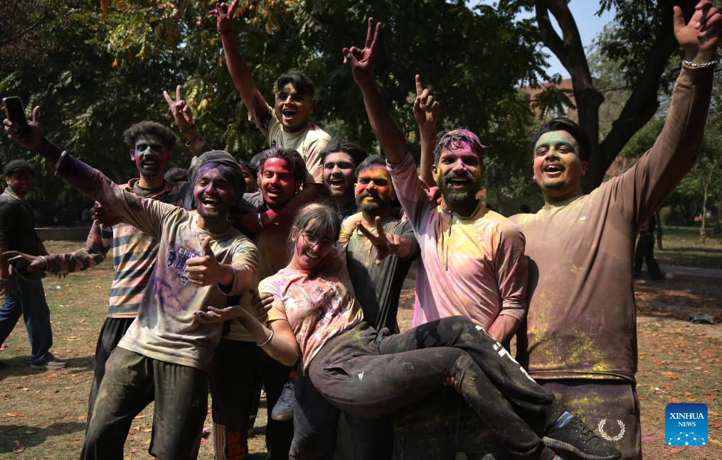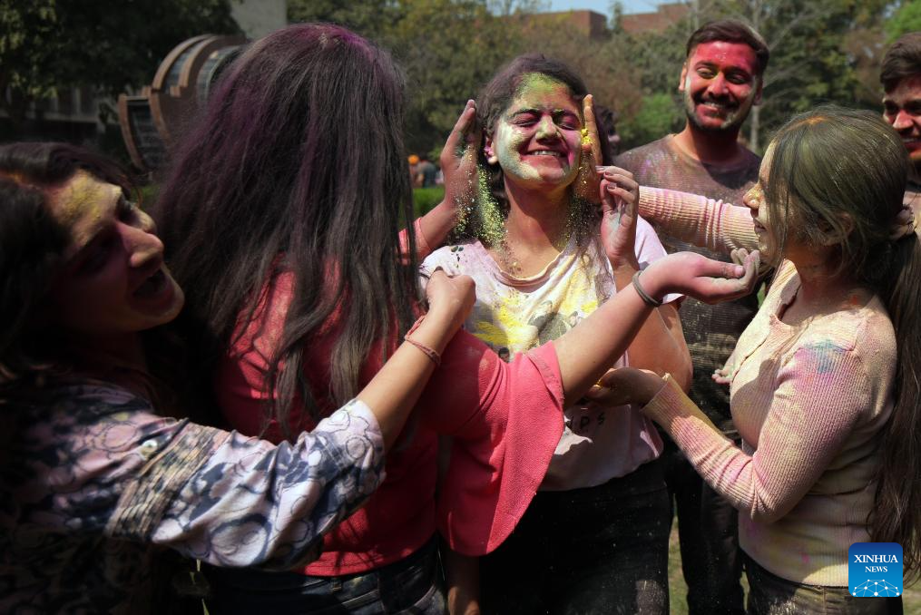 People smeared with colored powder take part in a celebration of the Holi festival in Amritsar district of India's northern Punjab state, March 22, 2024. Holi, the festival of colors, marks the beginning of the spring season. (Str/Xinhua)