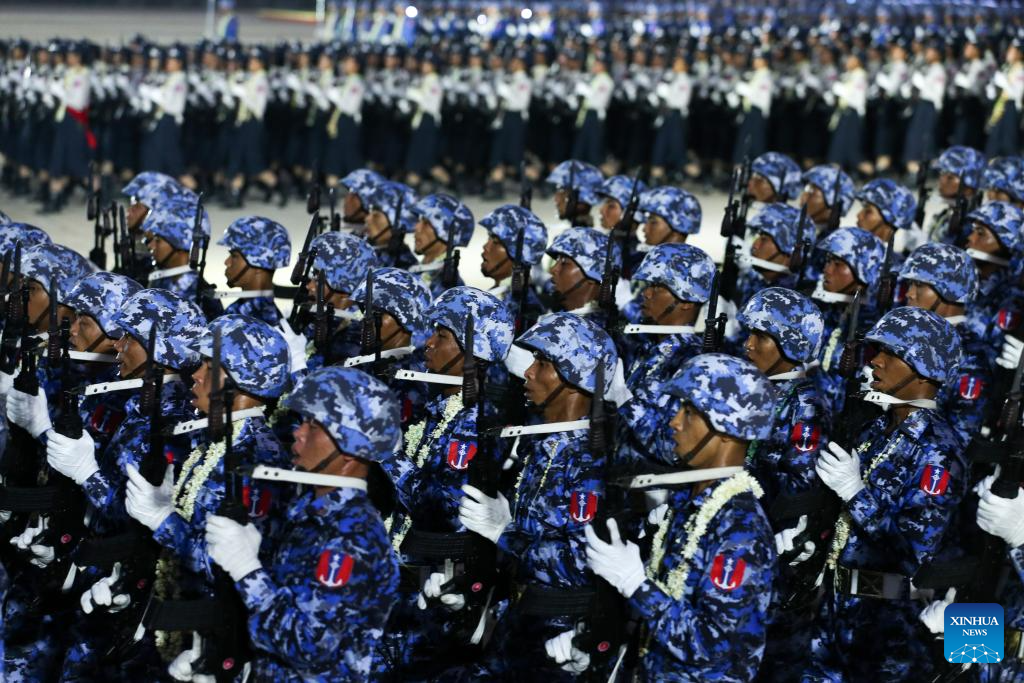 Soldiers march during a military parade to mark the 79th Armed Forces Day in Nay Pyi Taw, Myanmar, March 27, 2024. (Photo by Myo Kyaw Soe/Xinhua)