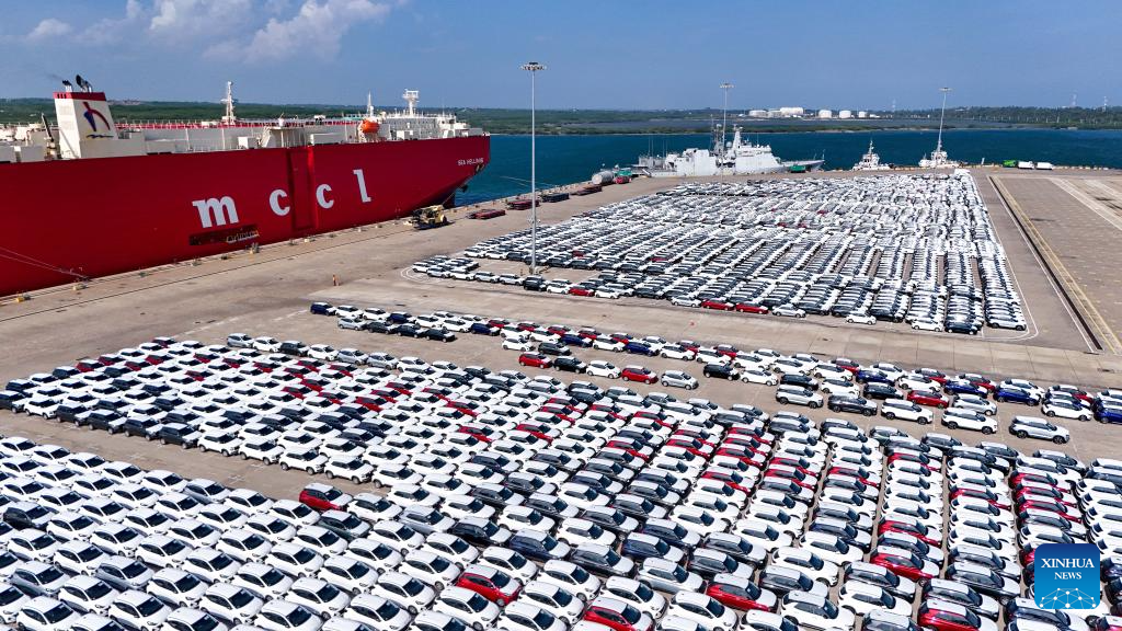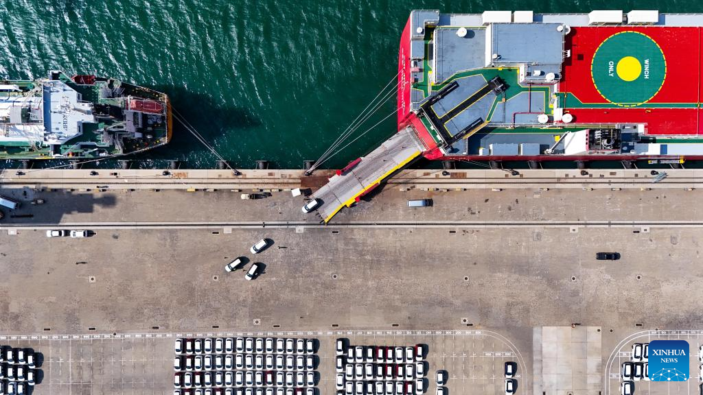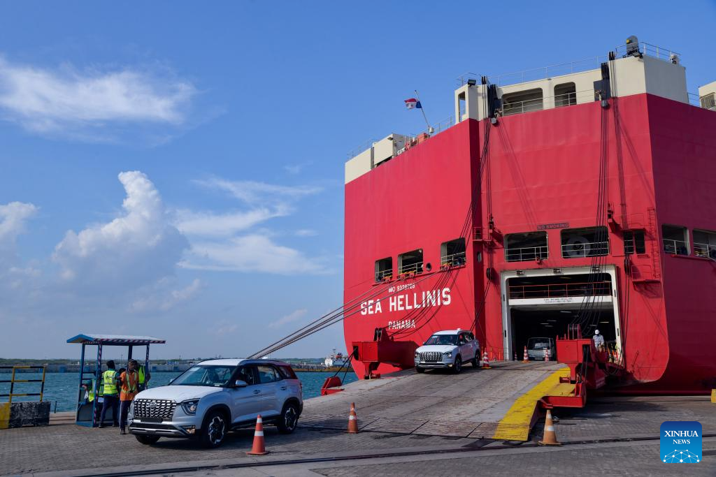 Vehicles move out from a "ro-ro" ship at the Hambantota Port in Sri Lanka, March 28, 2024. Located in the south of Sri Lanka, the Hambantota Port is one of the signature projects of Belt and Road cooperation between China and Sri Lanka. (Xinhua/Xu Qin)