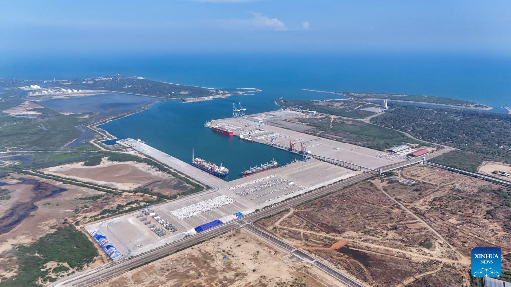 An aerial drone photo taken on March 28, 2024 shows the Hambantota Port in Sri Lanka. Located in the south of Sri Lanka, the Hambantota Port is one of the signature projects of Belt and Road cooperation between China and Sri Lanka. (Xinhua/Xu Qin)