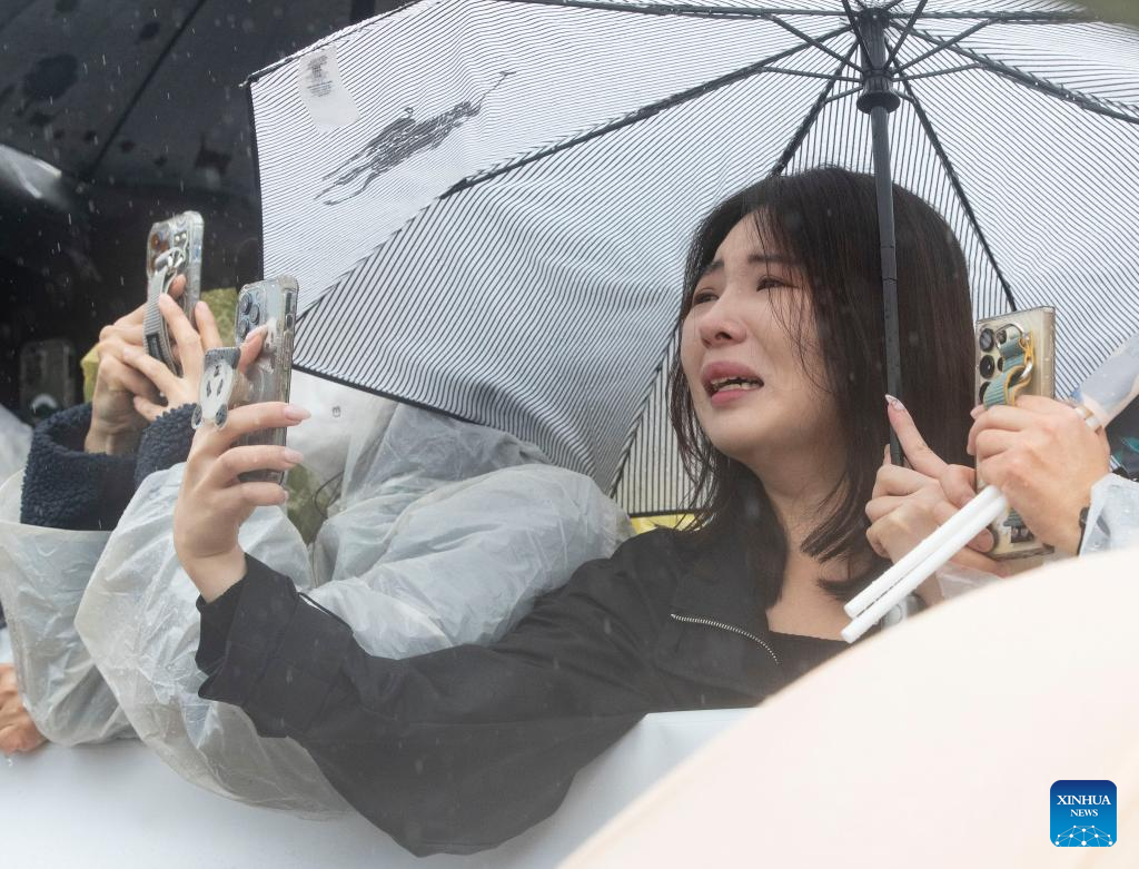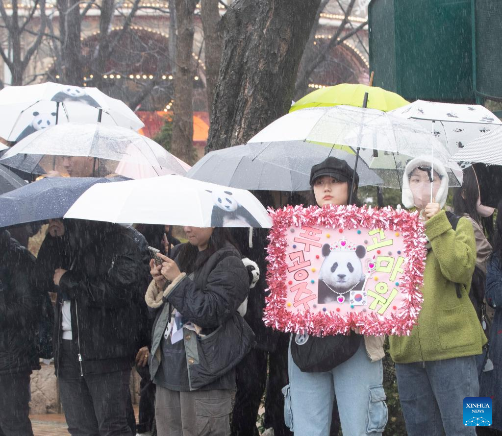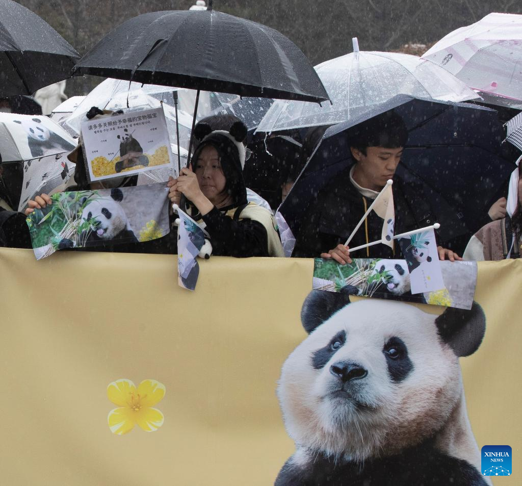 People bid farewell to giant panda Fu Bao amid rain at Everland in Yongin, South Korea, April 3, 2024. Beloved Fu Bao, the first giant panda born in South Korea, left South Korea for China on Wednesday amid a large crowd's tearful farewell.