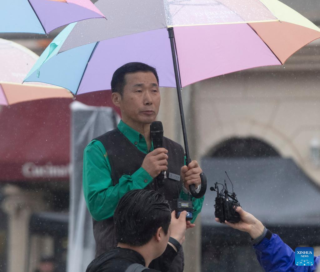 Kang Cheol-won, a zookeeper nicknamed the "grandpa of Fu Bao", speaks during a farewell event at Everland in Yongin, South Korea, April 3, 2024. Beloved Fu Bao, the first giant panda born in South Korea, left South Korea for China on Wednesday amid a large crowd's tearful farewell.
