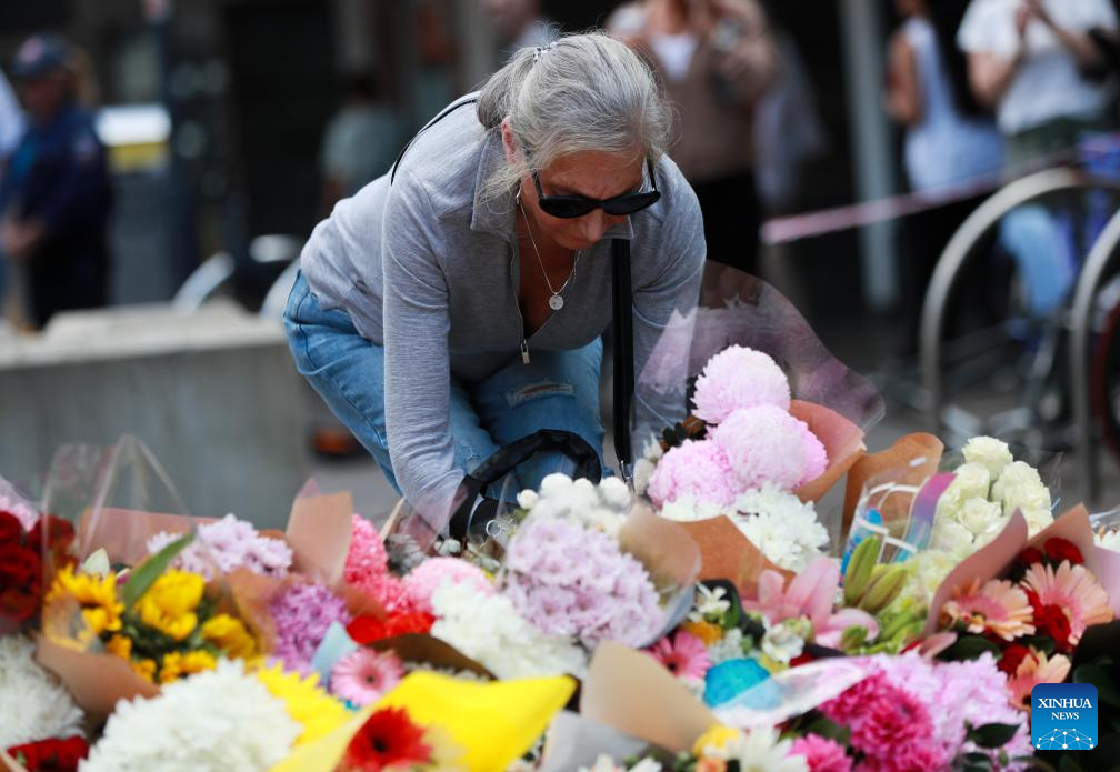 A woman lays flowers outside the Westfield Shopping Centre at Bondi Junction in Sydney, Australia, April 14, 2024. One Chinese citizen was killed and another wounded in a mass stabbing attack at a Sydney shopping center, the Chinese Consulate General in Sydney said on Sunday. (Xinhua/Ma Ping)