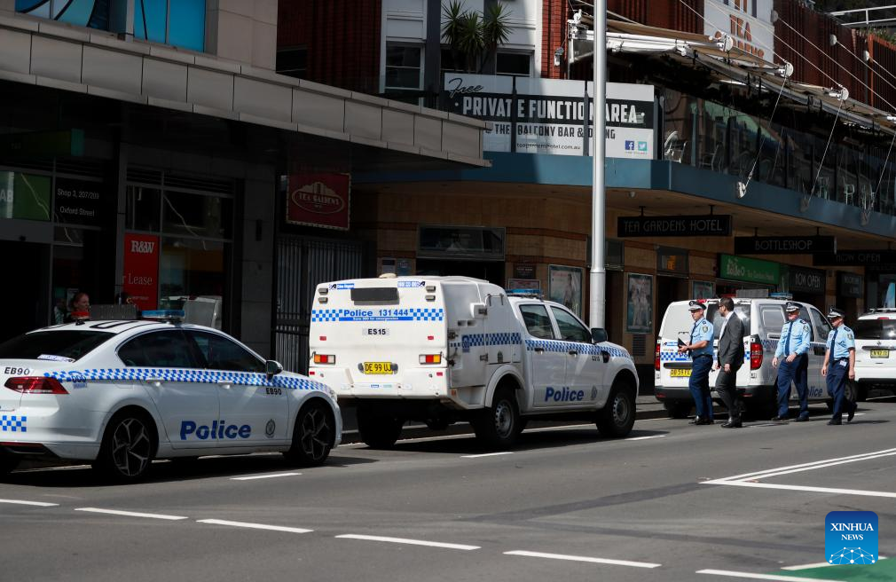 Police officers work outside the Westfield Shopping Centre at Bondi Junction in Sydney, Australia, April 14, 2024. One Chinese citizen was killed and another wounded in a mass stabbing attack at a Sydney shopping center, the Chinese Consulate General in Sydney said on Sunday. (Xinhua/Ma Ping)