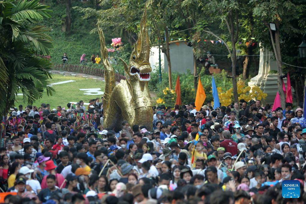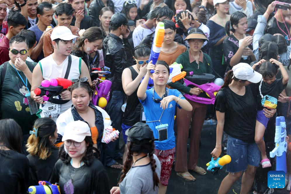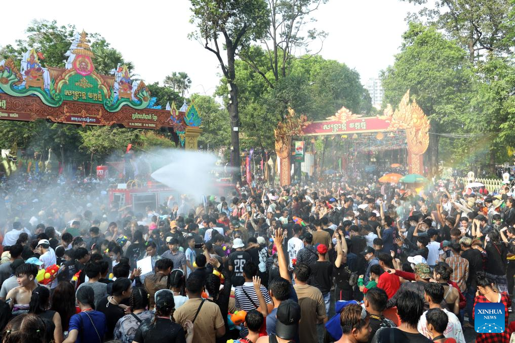 People participate in an activity to celebrate the Songkran festival, or the Cambodian New Year in Phnom Penh, Cambodia, April 13, 2024. The four-day Songkran festival kicked off on Saturday in Cambodia. (Photo by Sovannara/Xinhua)