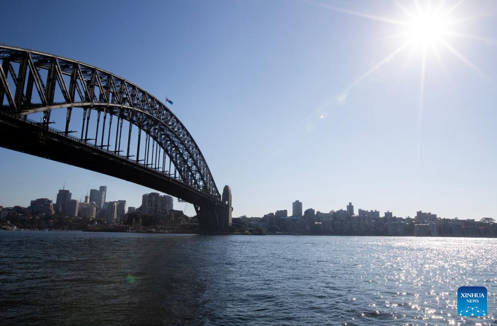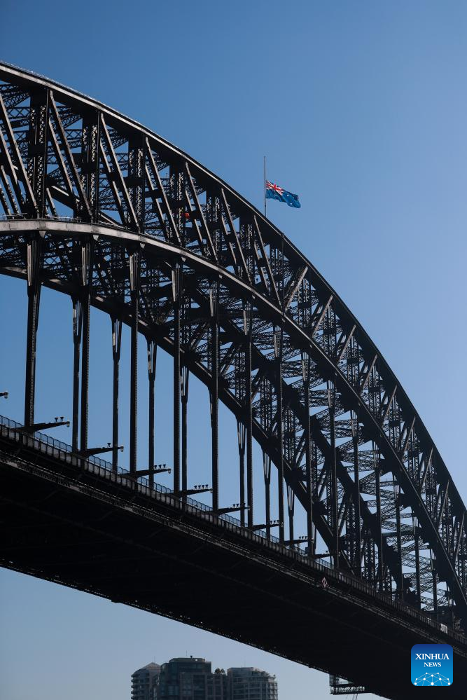 The Australian national flag atop the Sydney Harbour Bridge flies at half-mast to mourn for victims of the attack inside the Westfield Shopping Centre at Bondi Junction in Sydney, Australia, April 15, 2024. (Xinhua/Ma Ping)