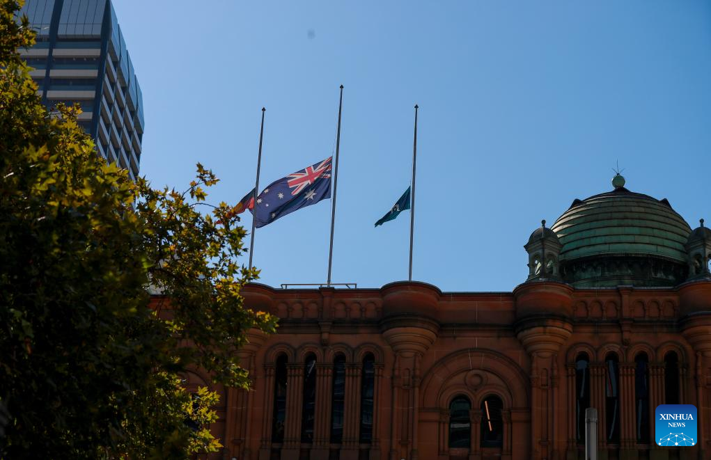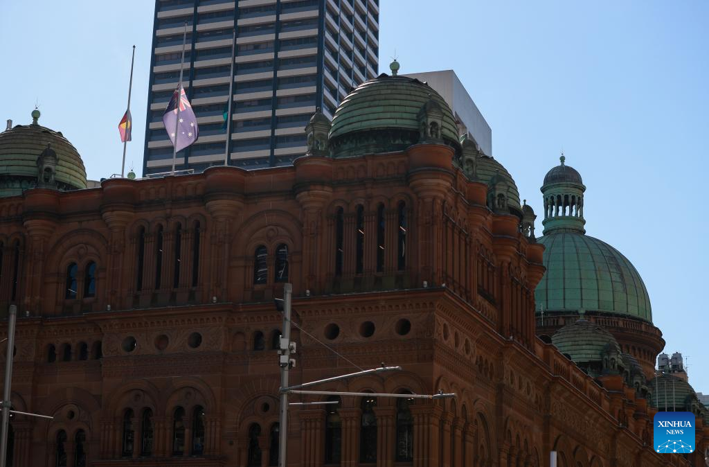 Flags atop the Queen Victoria Building fly at half-mast to mourn for victims of the attack inside the Westfield Shopping Centre at Bondi Junction in Sydney, Australia, April 15, 2024. (Xinhua/Ma Ping)