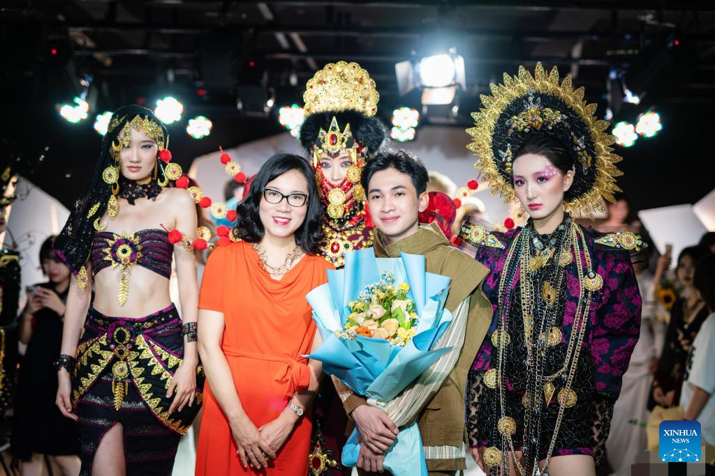Yusuf Maulana Firdaus (Front R), an international student from Jakarta, Indonesia, poses for photos with his teacher Huang Yanbing (Front L) among fashion models in Nanning, capital of south China's Guangxi Zhuang Autonomous Region, June 17, 2023. (Xinhua)