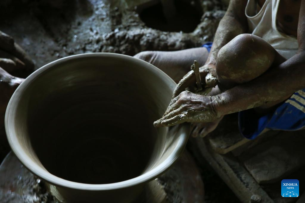 A potter works at a workshop in Twante Township of Yangon Region, Myanmar, April 29, 2024.