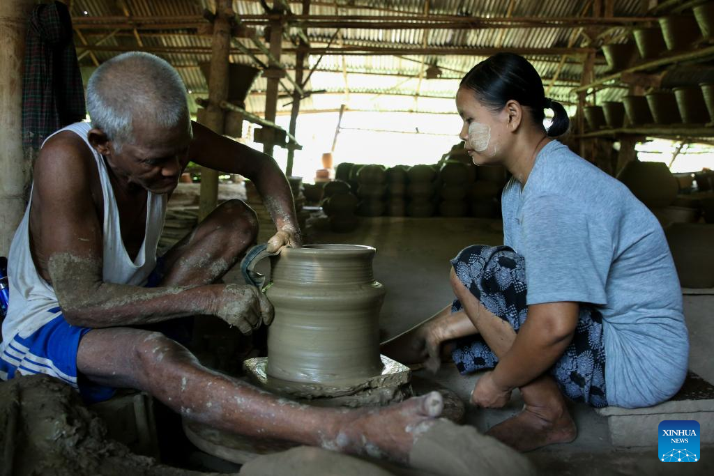 A potter shapes a clay pot in Twante Township of Yangon Region, Myanmar, April 29, 2024.