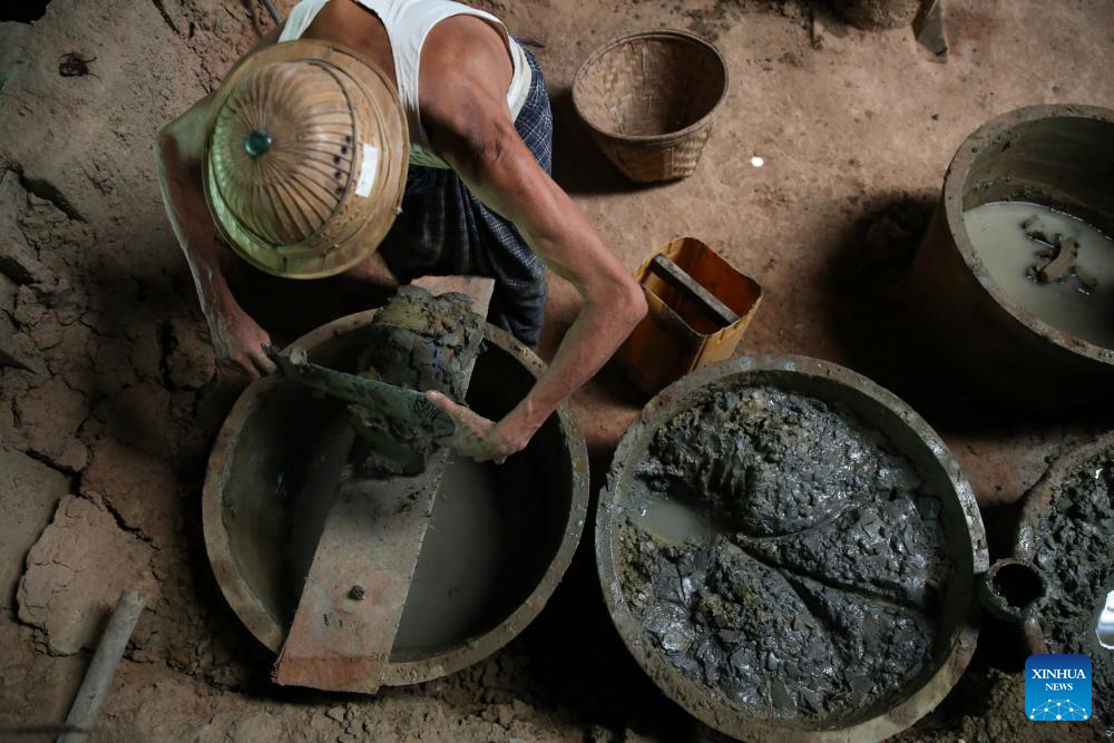YANGON, April 29 (Xinhua) -- The traditional art of clay pot making in Myanmar is facing a decline as the number of skilled potters dwindles. Thus, the presence of clay pot making businesses today is essential for safeguarding Myanmar's traditional pottery heritage, the owner of the U Tun Yi and Daw Toe clay pot business, Daw Toe, 84, who lives in Twante Township of Yangon Region, told Xinhua.
