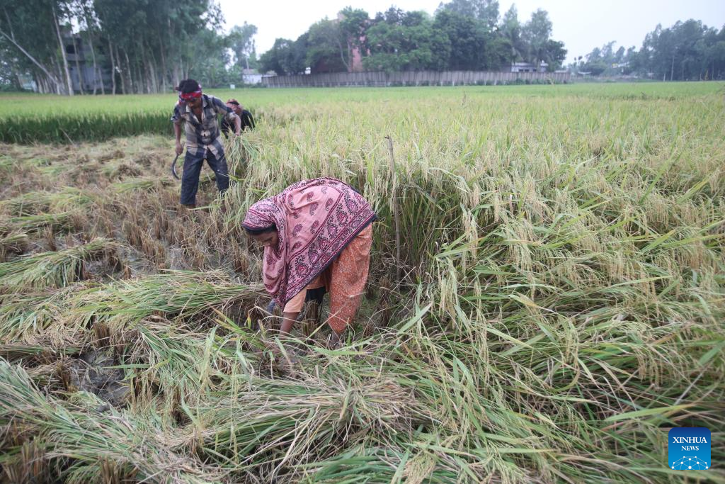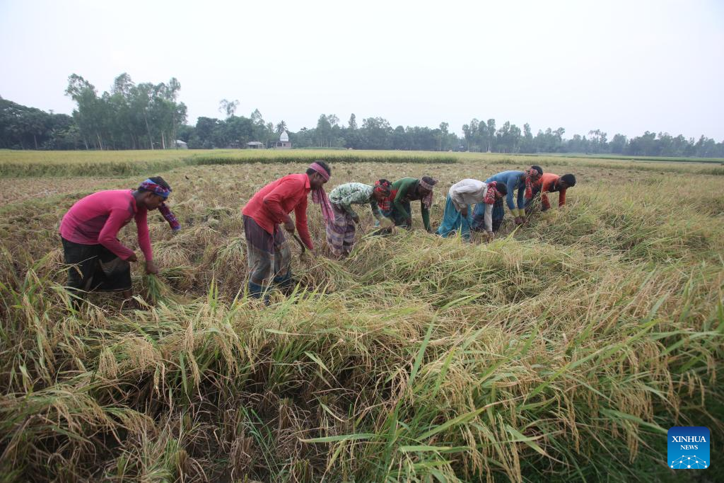 Farmers use sickles to harvest the rice in a field in Natore, Bangladesh on May 4, 2024. (Xinhua)