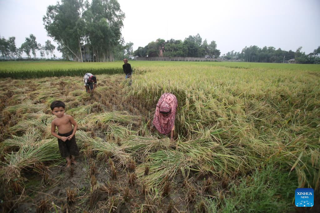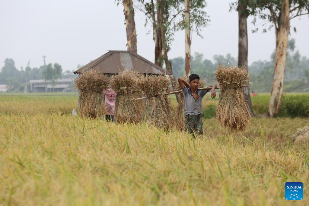 Farmers carry bundles of rice grain stalks during the rice harvesting season in Natore, Bangladesh on May 4, 2024. (Xinhua)