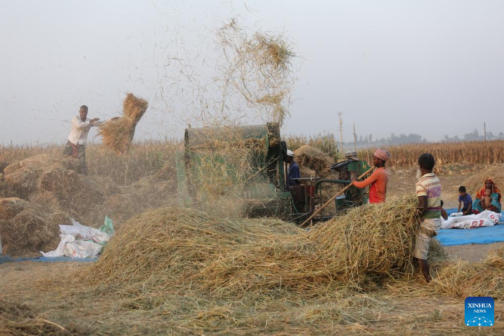 Farmers use a threshing machine to harvest the rice in Natore, Bangladesh on May 3, 2024. (Xinhua)