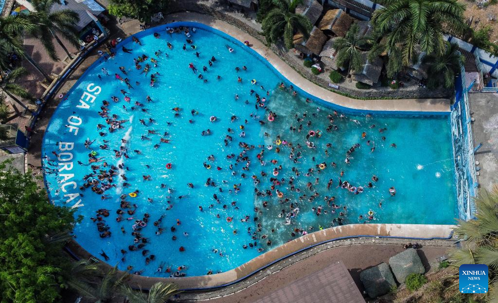 An aerial drone photo taken on May 5, 2024 shows people cooling off in a swimming pool at a resort in Bulacan Province, the Philippines. People spend time at pools to cool off amid heatwave in the Philippines. (Xinhua/Rouelle Umali)
