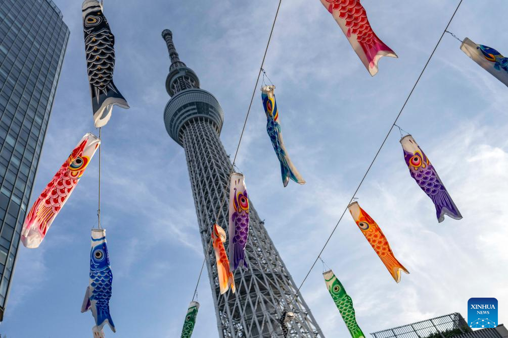 Traditional carp-shaped windsocks called "Koinobori", a symbol of good health and strength for children, are hung up to celebrate the Children's day in Tokyo, Japan, on May 5, 2024. (Photo by Gu Yiping/Xinhua)