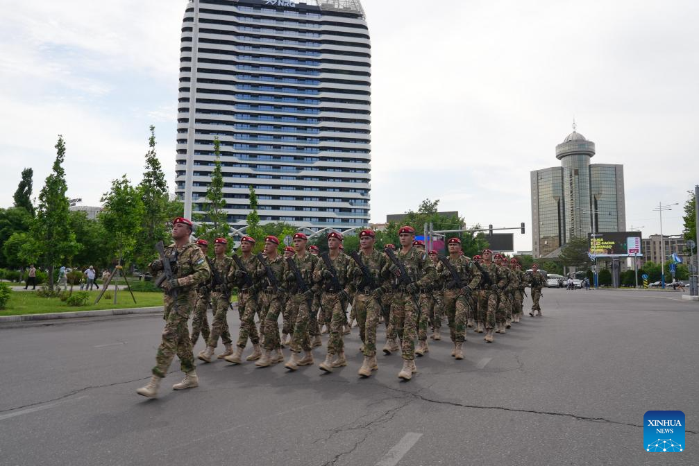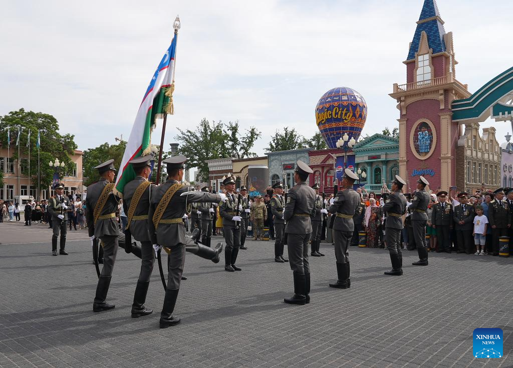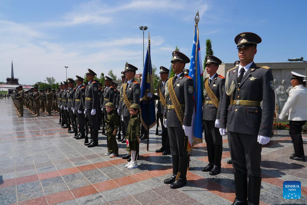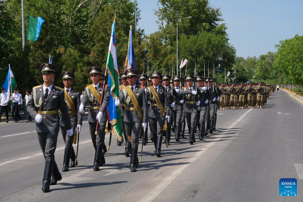 Soldiers participate in a Victory Day military parade in Tashkent, Uzbekistan, May 8, 2024. (Photo by Zafar/Xinhua)