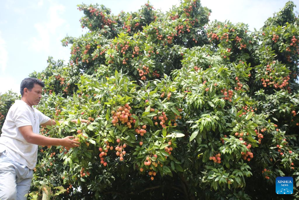 A man harvests lychees at an orchard in Narayanganj, Bangladesh on May 11, 2024. (Xinhua)