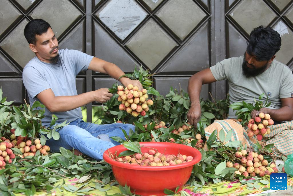 People arrange newly-picked lychees in Narayanganj, Bangladesh on May 11, 2024. (Xinhua)