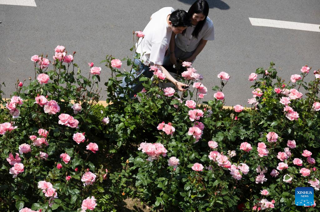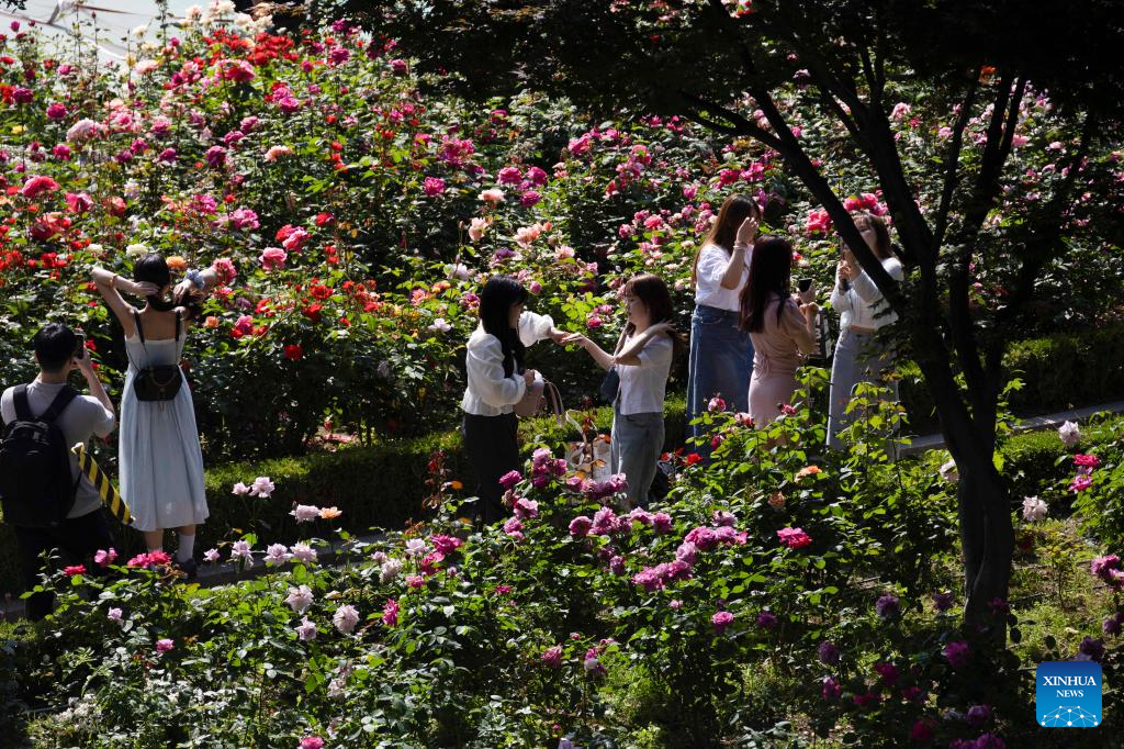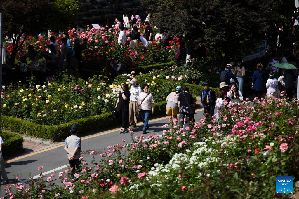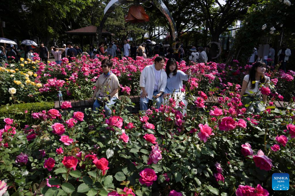 People enjoy flowers at the Seoul Rose Festival in Seoul, South Korea, May 19, 2024. The festival is running from May 18 to 25. (Photo by Jun Hyosang/Xinhua)