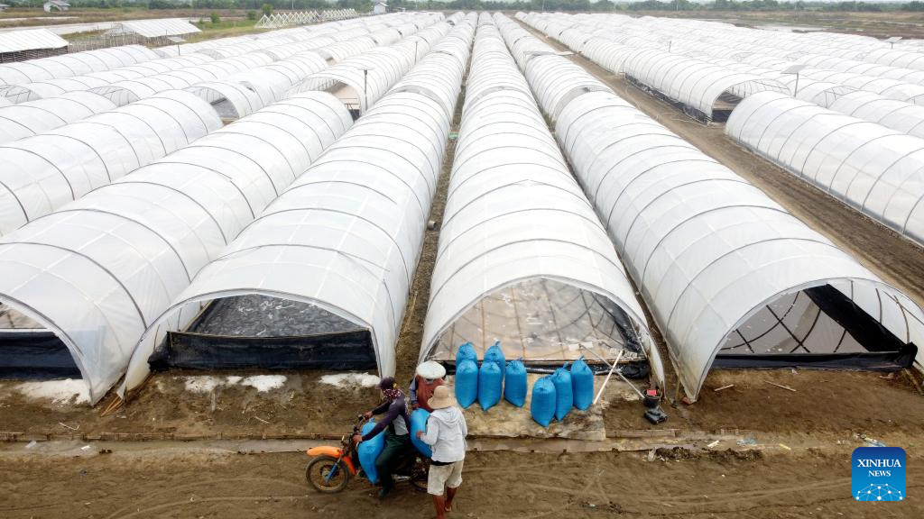 An aerial drone photo taken on June 1, 2024 shows farmers moving bags of salt onto a motorbike at Bungkolor village in Cirebon, West Java, Indonesia. (Photo by Yorri Farli/Xinhua)