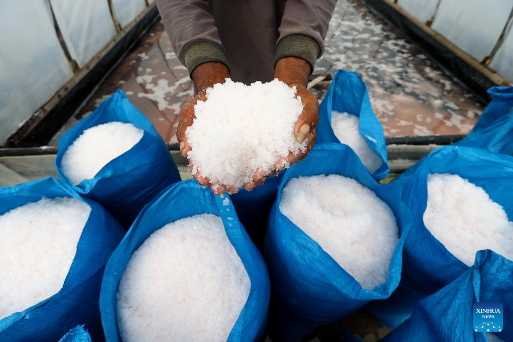 A farmer shows a handful of salt at Bungkolor village in Cirebon, West Java, Indonesia, June 1, 2024. (Photo by Yorri Farli/Xinhua)