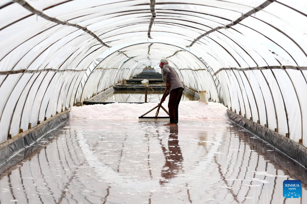 A farmer works at a salt farm at Bungkolor village in Cirebon, West Java, Indonesia, June 1, 2024. (Photo by Yorri Farli/Xinhua)