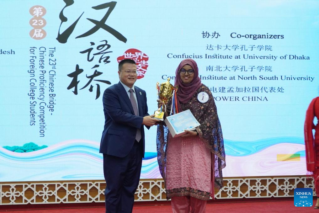 Yao Wen, Chinese ambassador to Bangladesh, presents an award to a contestant during the 23rd Chinese Bridge - Chinese proficiency competition for foreign college students in Dhaka, Bangladesh on May 31, 2024. Talk shows in Chinese, lion dances and classical Chinese dances have been staged, with nine contestants from three Confucius Institutes (Classroom) in Bangladesh vying for the crown in the 23rd "Chinese Bridge" competition.