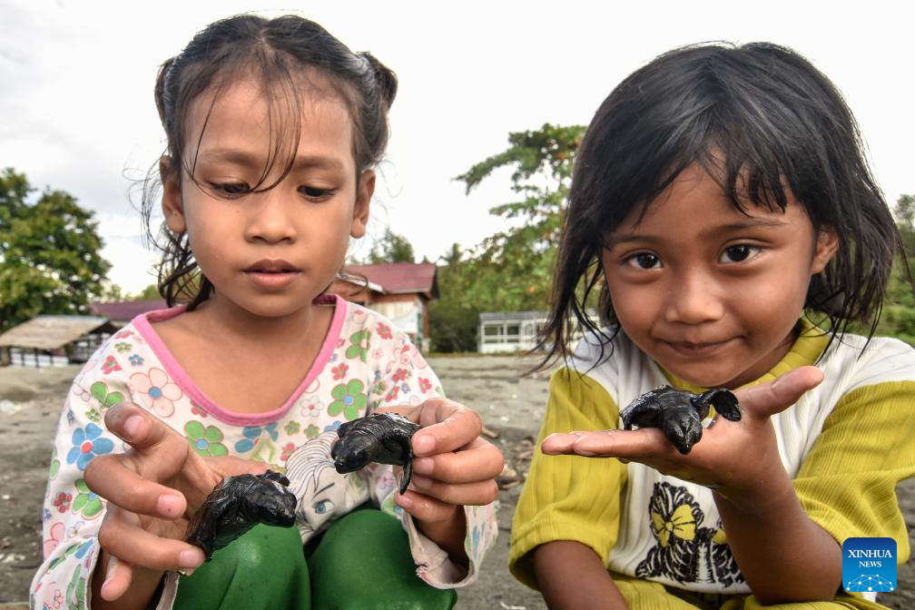 Children hold baby hawksbill sea turtles before releasing them to the sea on the occasion of World Environment Day in Donggala regency, Central Sulawesi, Indonesia, June 5, 2024. (Photo by Adi Pranata/Xinhua)