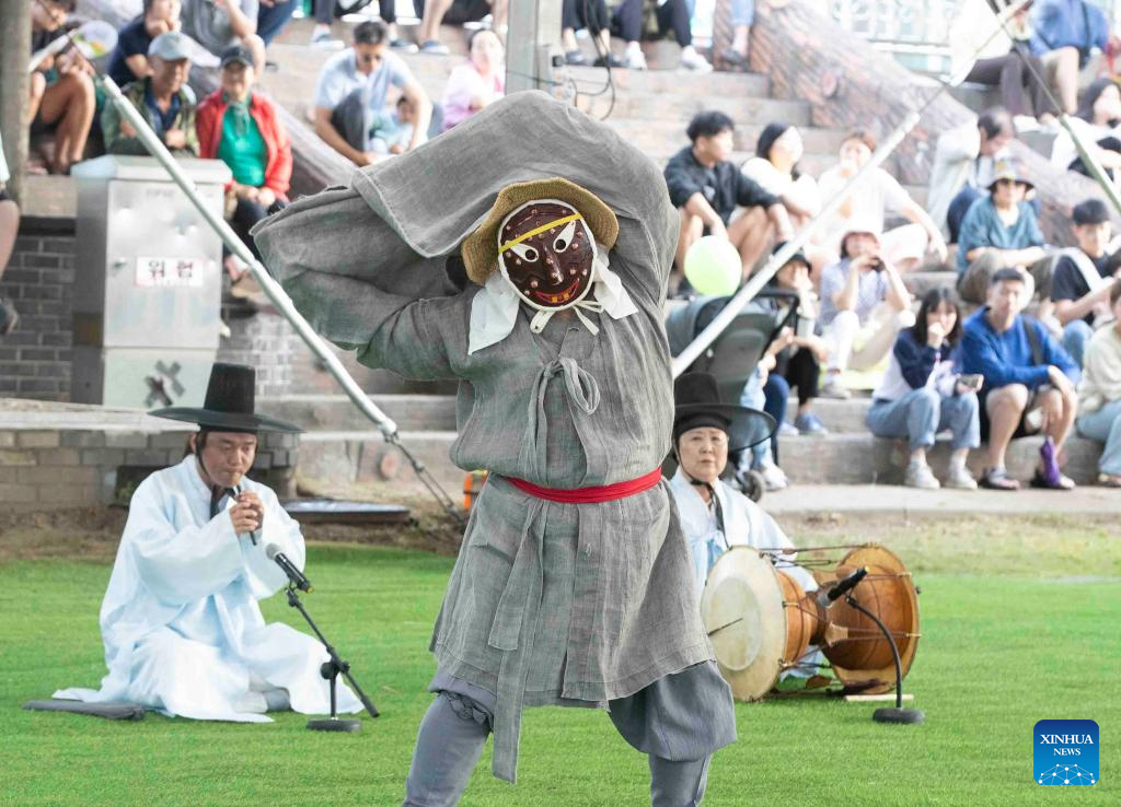 People perform mask dance during the Gangneung Danoje Festival celebrations in Gangneung City of South Korea, on June 8, 2024. Various activities on folk customs were held on Saturday during the Gangneung Danoje Festival celebrations. (Xinhua/Yao Qilin)