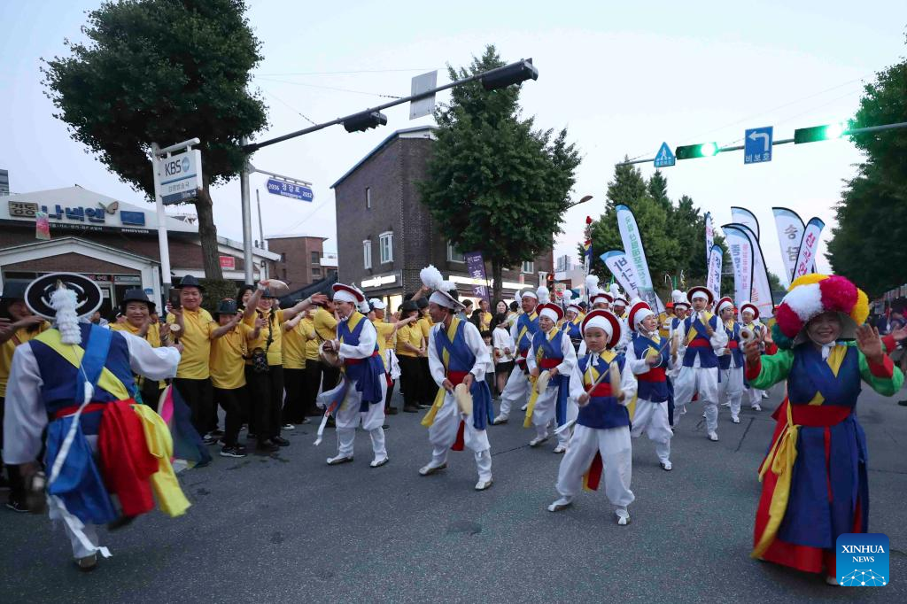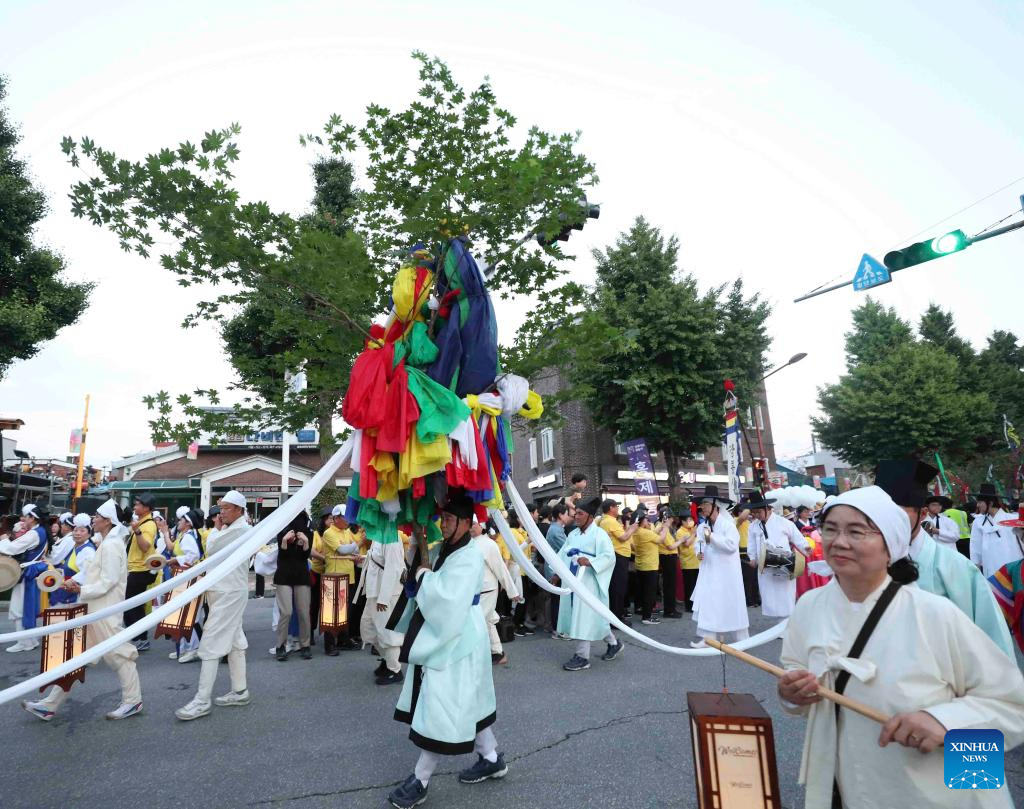 People play music during the Gangneung Danoje Festival celebrations in Gangneung City of South Korea, on June 8, 2024. Various activities on folk customs were held on Saturday during the Gangneung Danoje Festival celebrations. (Xinhua/Yao Qilin)