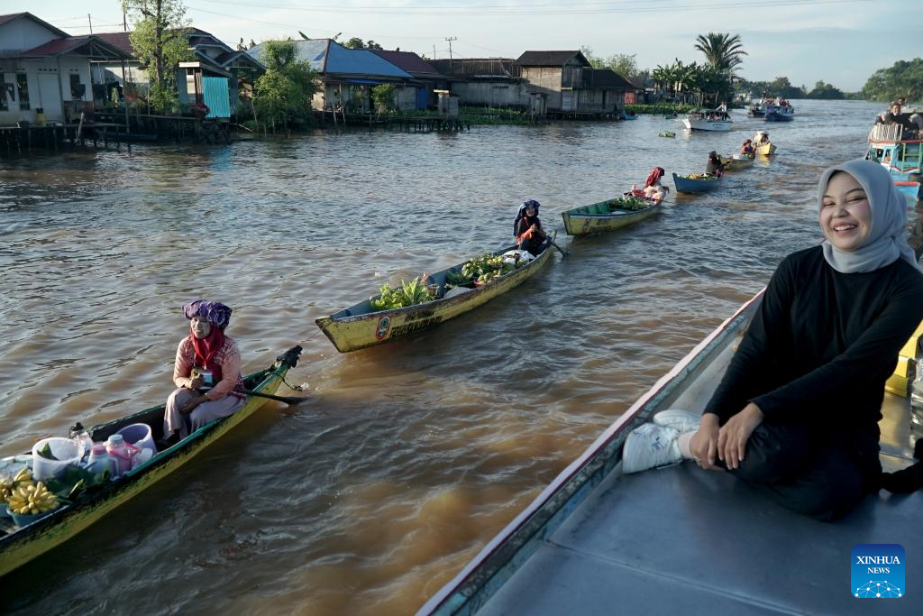 Vendors riding in klotok boats offer products to costumers at a floating market of Lok Baintan village in Banjar regency, South Kalimantan, Indonesia, June 12, 2024. (Photo by Bahaudin/Xinhua)