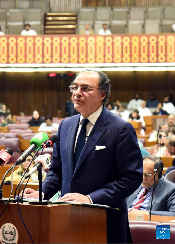 This photo released by Pakistan's Press Information Department (PID) shows Pakistan's Federal Minister for Finance and Revenue Muhammad Aurangzeb presenting the federal budget for the upcoming fiscal year starting from July 2024 to June 2025 in the country's national assembly in Islamabad, Pakistan, on June 12, 2024. The new budget, pending majority approval in the national assembly, with a total outlay of 18,900 billion rupees (about 67.84 billion U.S. dollars), is set to be formally implemented on July 1 following the president's final approval. (PID/Handout via Xinhua)