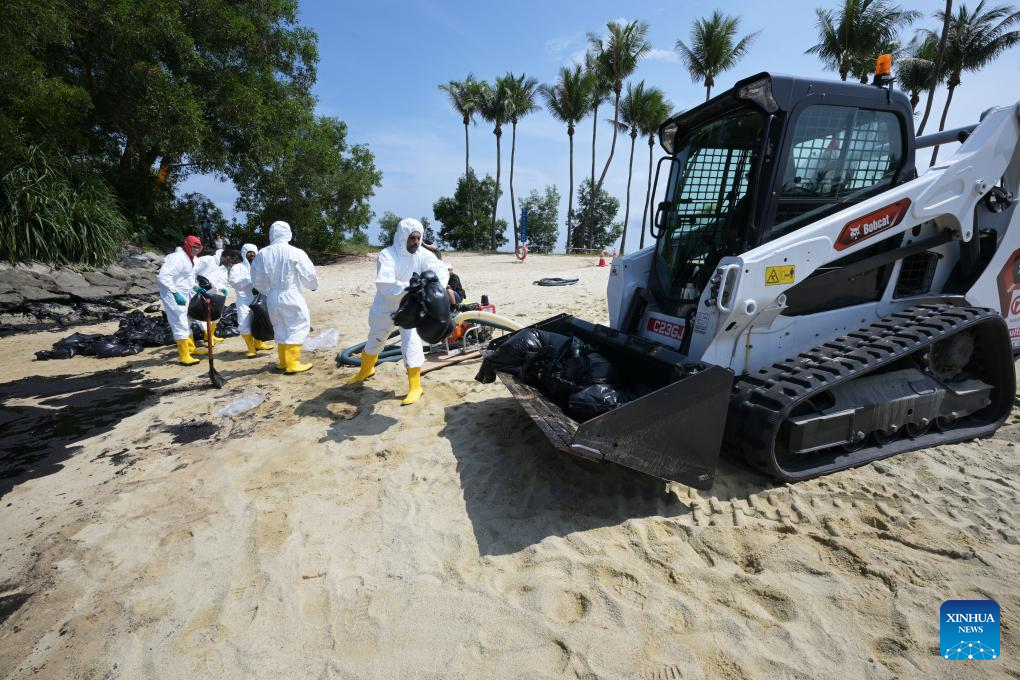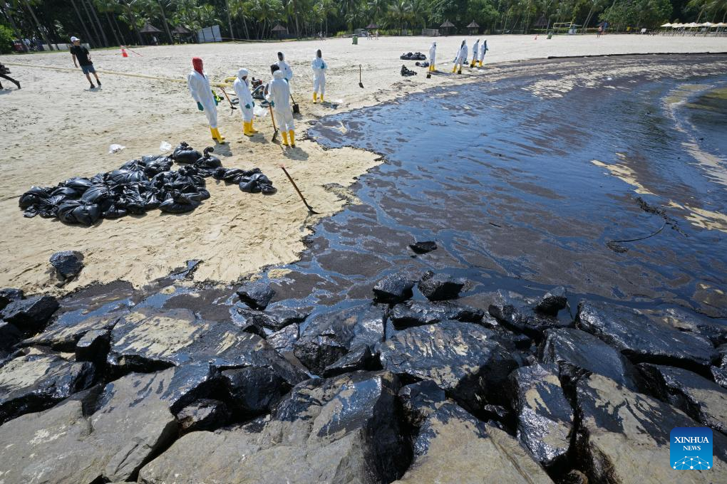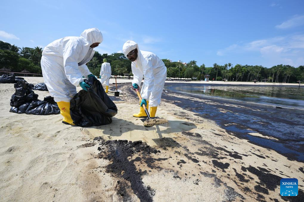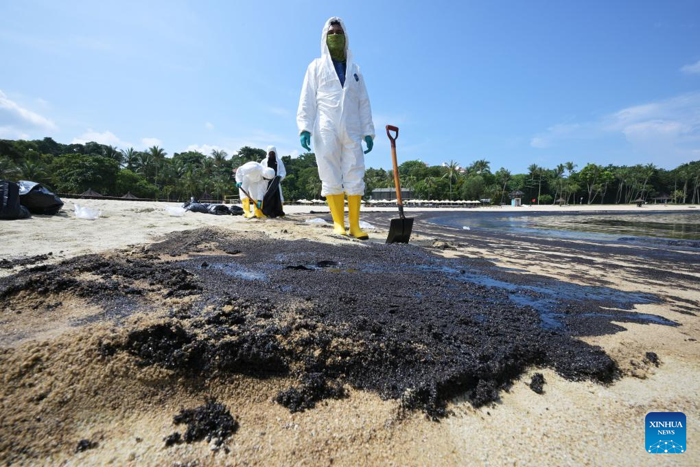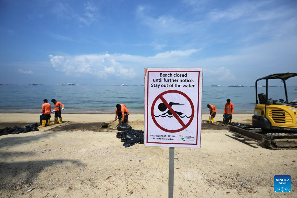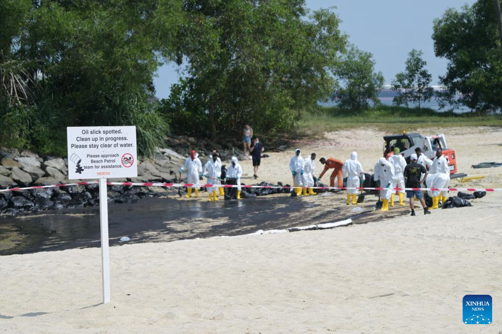 SINGAPORE, June 15 (Xinhua) -- Oil spillage was observed along beaches on Singapore's resort Sentosa island and the waters were closed for clean-up works, the island management authority said Saturday.