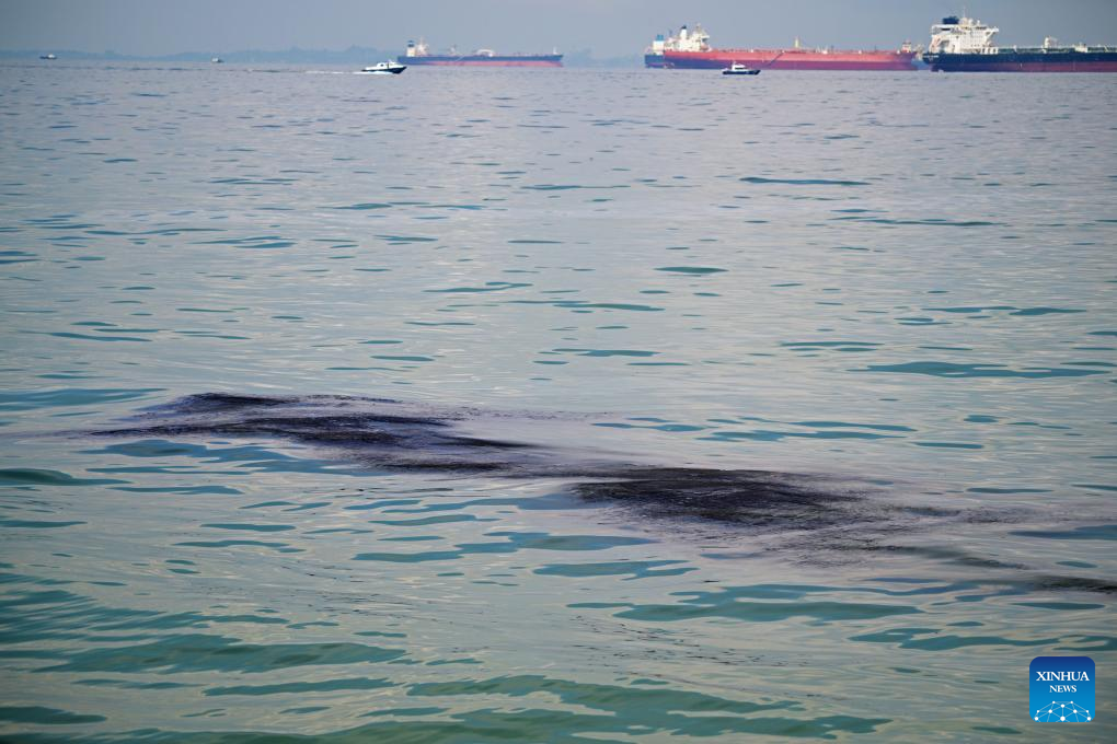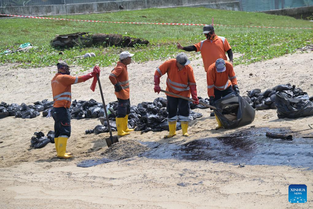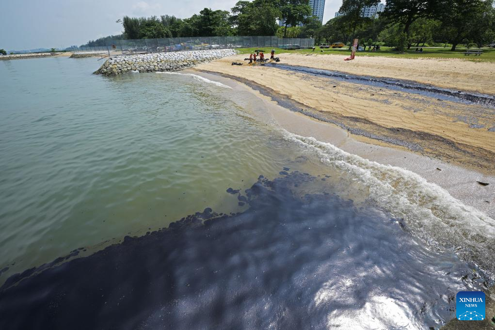 The oil slick was also spotted at Singapore's East Coast Park, shores around the Southern Islands and surrounding waters. (Photo by Then Chih Wey/Xinhua)