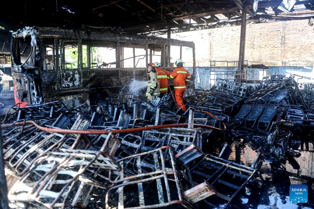 Firefighters try to extinguish a bus fire at a garage in Surabaya, East Java, Indonesia, June 22, 2024. No casualty was reported in this fire. (Photo by Sahlan Kurniawan/Xinhua)