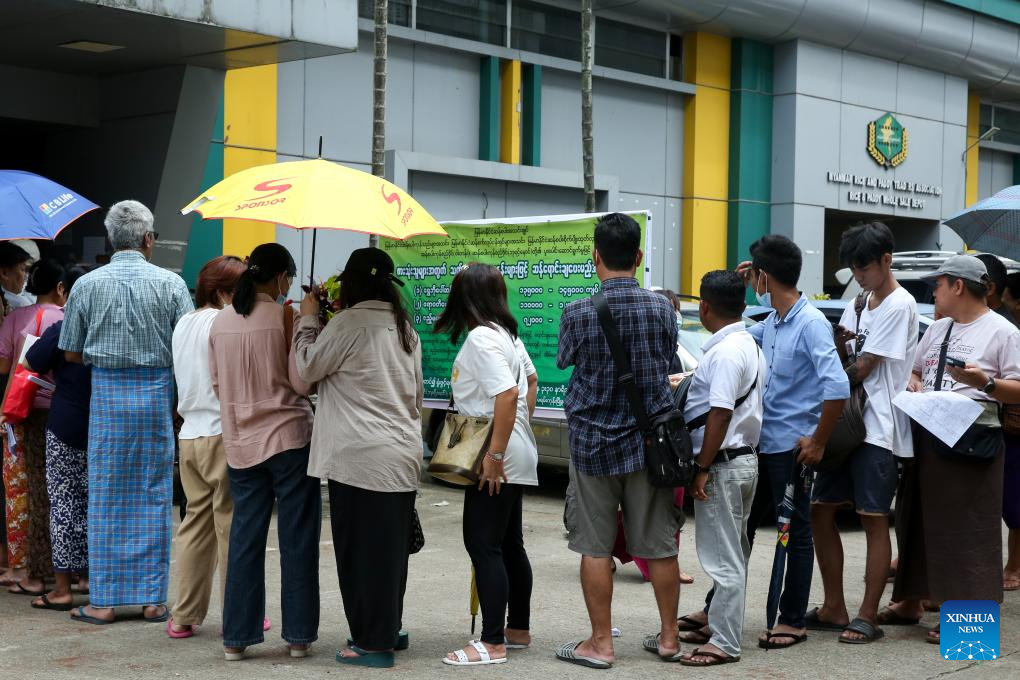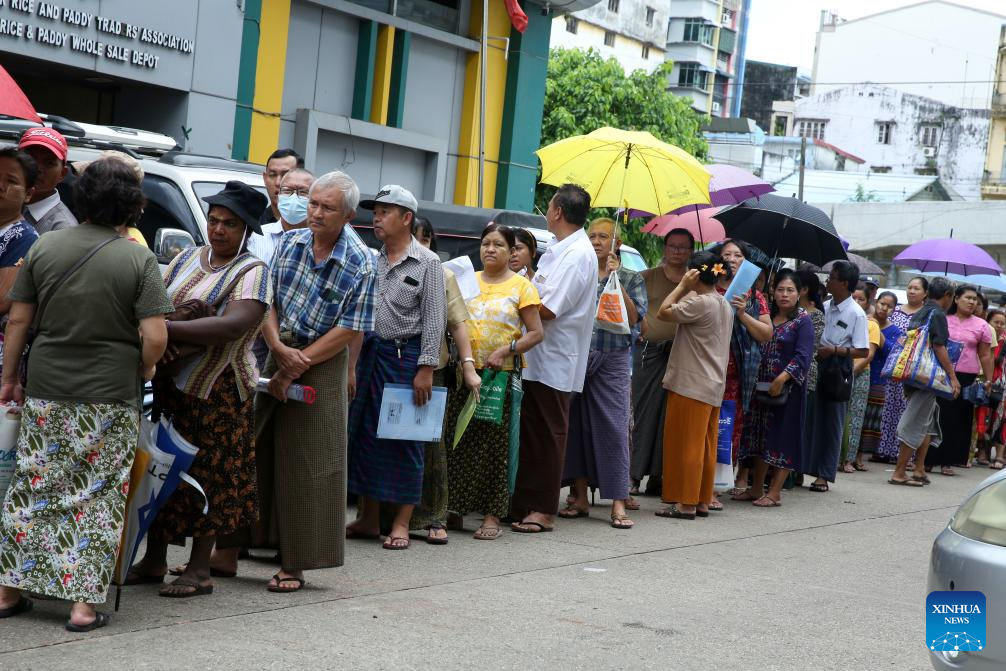 People stand in a queue to buy rice outside the Rice and Paddy Wholesale Depot in Yangon, Myanmar, June 25, 2024. (Xinhua/Myo Kyaw Soe)
