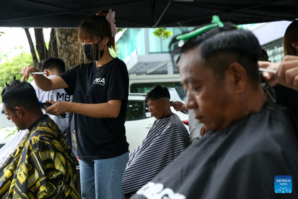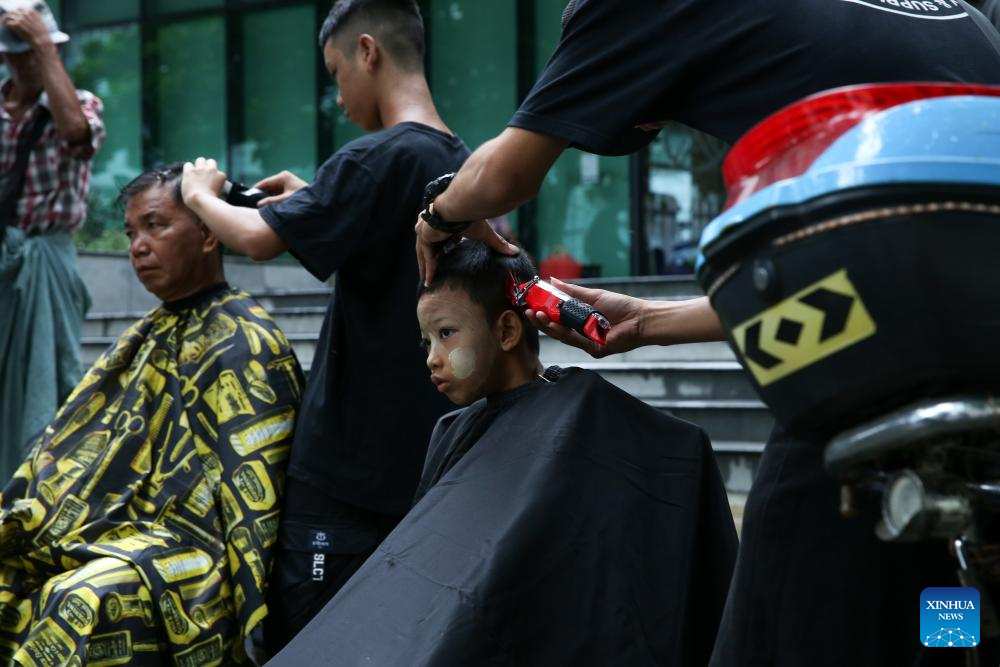 Young hairdressers from Myanmar Barber Academy offer free haircuts in Botataung Township of Yangon, Myanmar, June 29, 2024.(Xinhua/Myo Kyaw Soe)