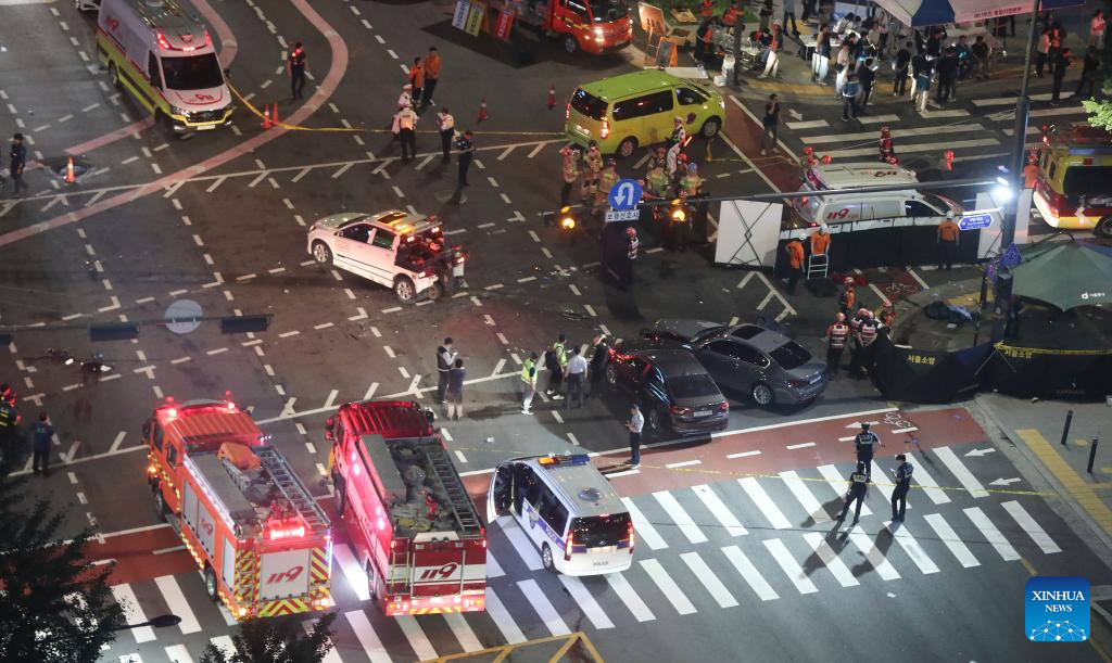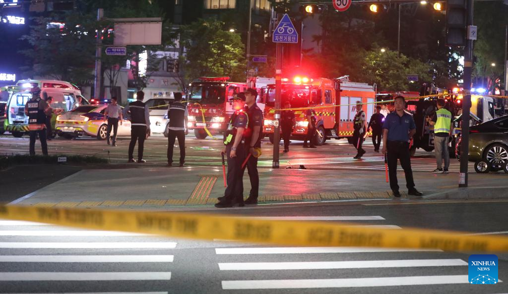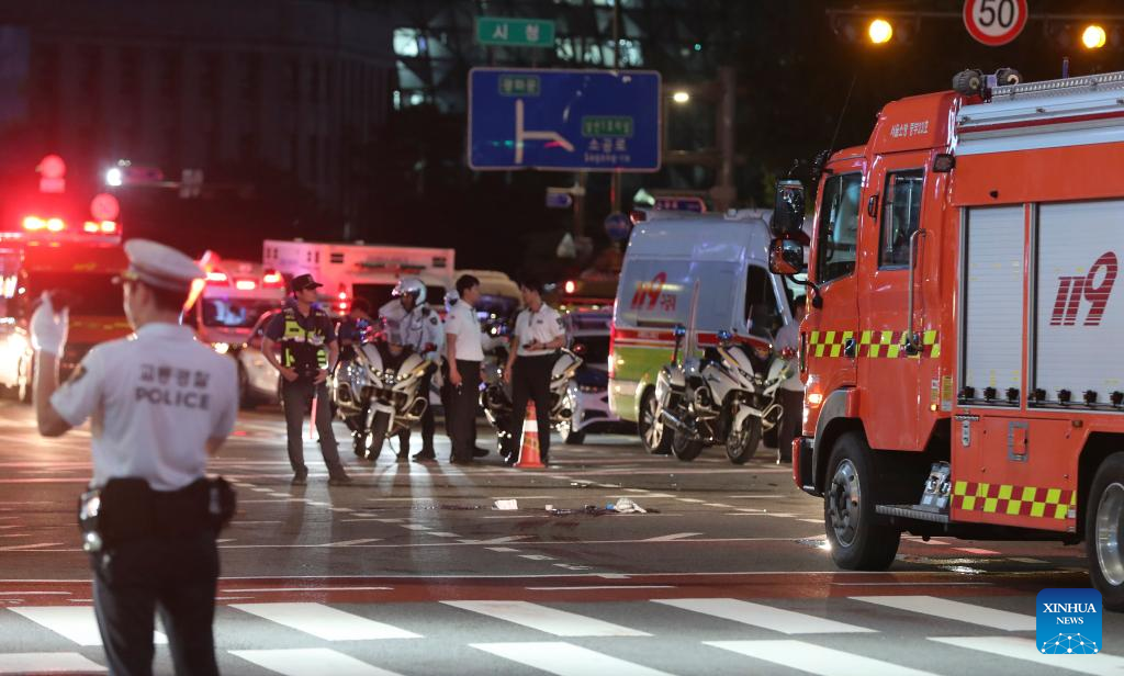 This photo taken on July 1, 2024 shows the site of a traffic accident in Seoul, South Korea. Six people had been confirmed dead and eight others injured in a traffic accident in South Korea, Yonhap news agency reported Monday. A major vehicle accident took place at about 9:30 p.m. local time (1230 GMT) near an intersection of the Seoul City Hall. (Xinhua/Yao Qilin)