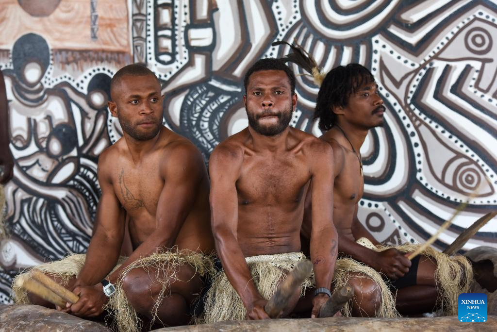 People play drums at the national museum in Port Vila, Vanuatu, June 30, 2024. (Xinhua/Guo Lei)