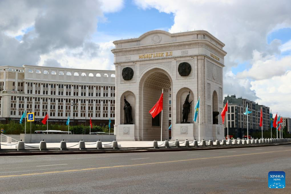 Chinese and Kazakh national flags are seen hoisted in Astana, Kazakhstan, July 2, 2024. (Xinhua/Wang Jianhua)