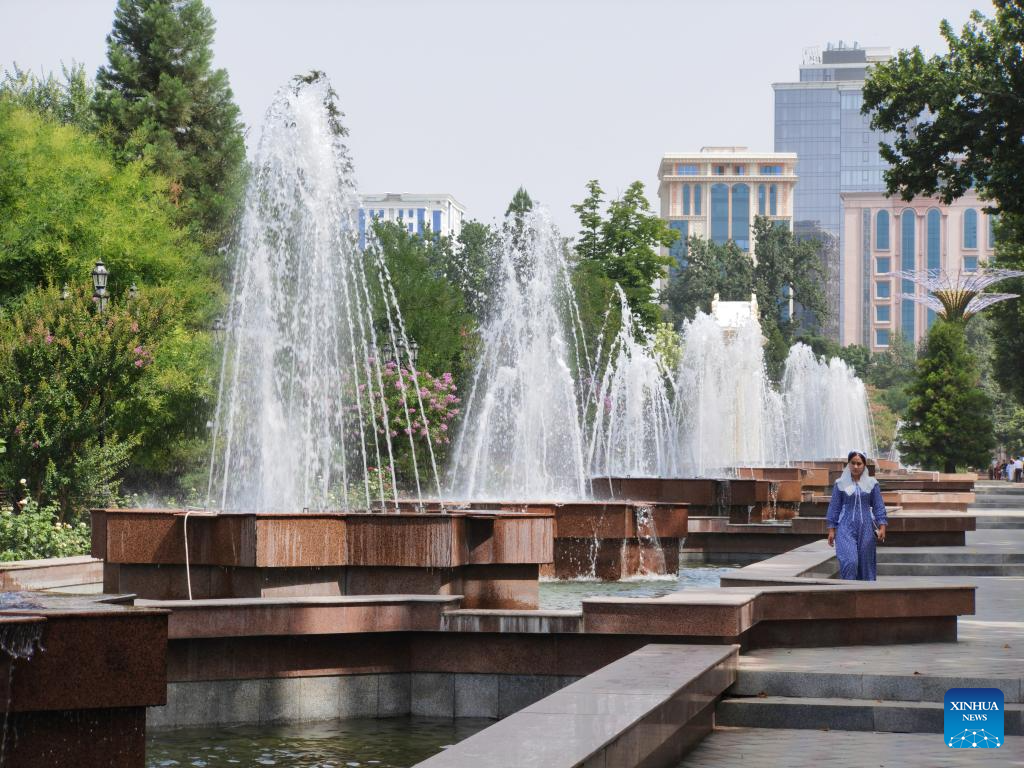This photo taken on July 2, 2024 shows a view of Rudaki Park in Dushanbe, Tajikistan. Tajikistan is located in the southeast of Central Asia, with a mountainous area exceeding 90 percent of its total area. Dushanbe is the capital of Tajikistan and the country's economic and cultural center. (Xinhua/Yan Yan)