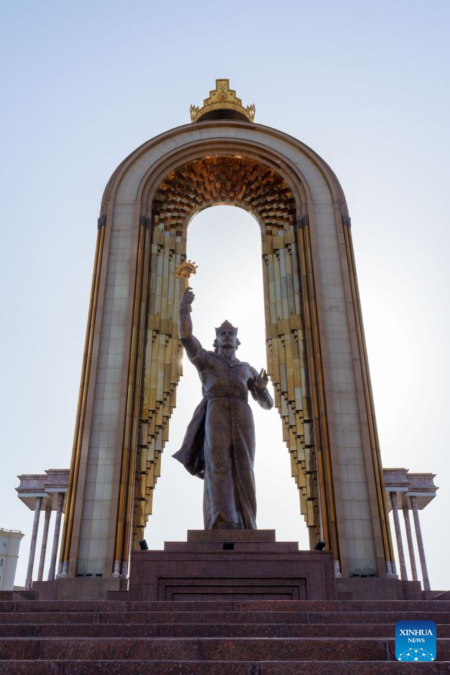 This photo taken on July 3, 2024 shows the monument of Ismoil Somoni in Dushanbe, Tajikistan. Tajikistan is located in the southeast of Central Asia, with a mountainous area exceeding 90 percent of its total area. Dushanbe is the capital of Tajikistan and the country's economic and cultural center. (Xinhua/Zhou Dixiao)