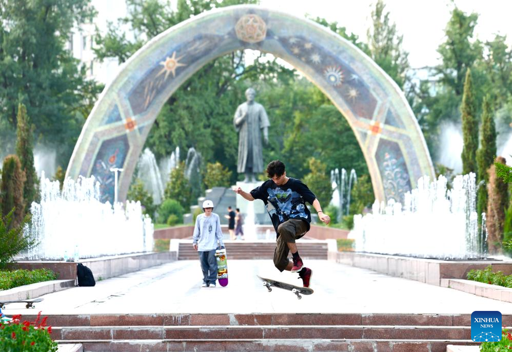 People practice skateboarding at Rudaki Park in Dushanbe, Tajikistan, June 29, 2024. Tajikistan is located in the southeast of Central Asia, with a mountainous area exceeding 90 percent of its total area. Dushanbe is the capital of Tajikistan and the country's economic and cultural center. (Xinhua/Yao Dawei)